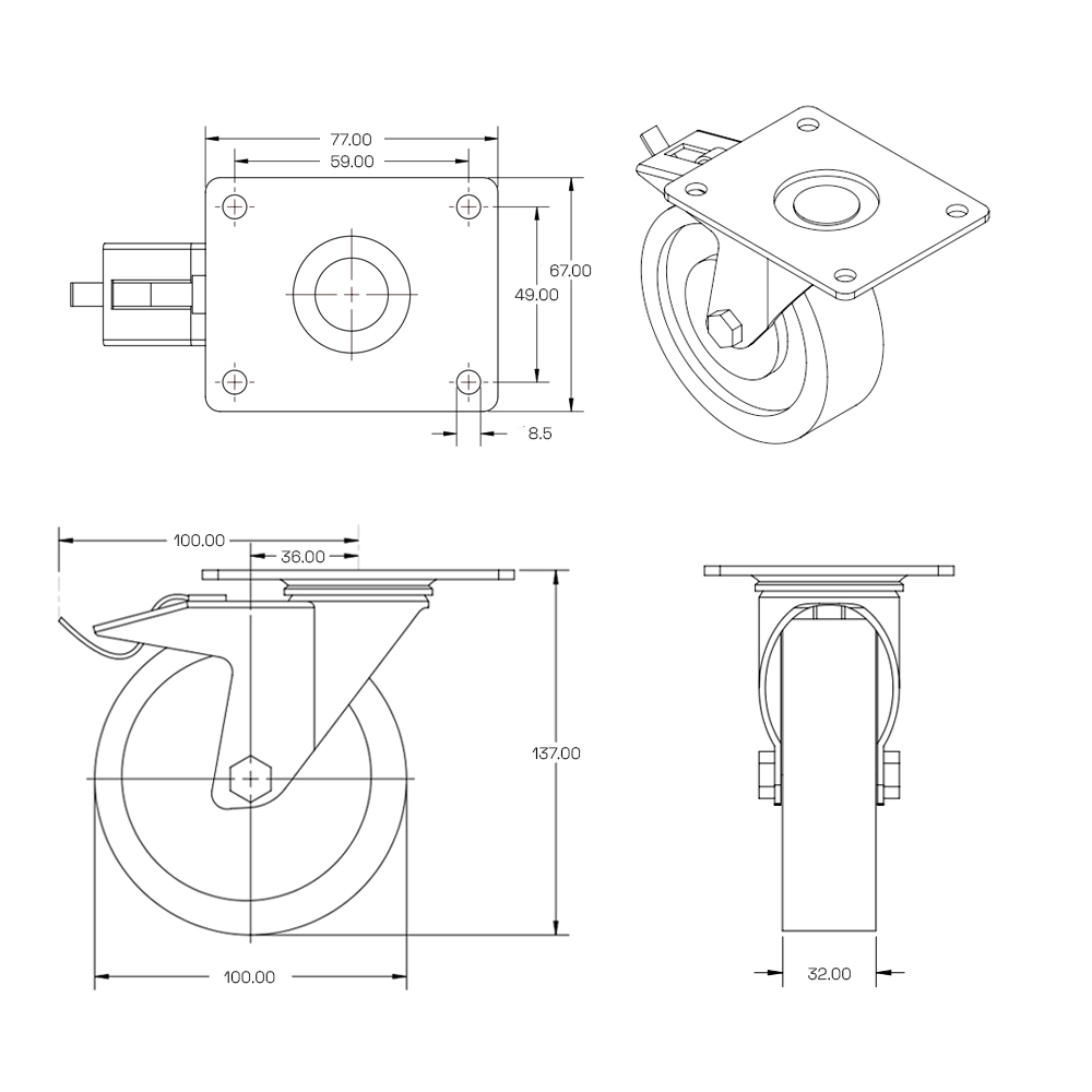 Cette roulette pivotante freinée grise avec plateau supérieur a un diamètre de 100 mm et une capacité de charge de 100 kg. Le pneu est en caoutchouc thermoplastique et le corps de roue en polypropylène.