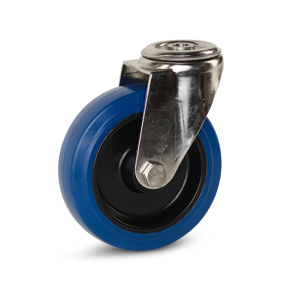 Roulette pivotante à trou central chape en Inox roue caoutchouc élastique bleu 125 mm 120 kg