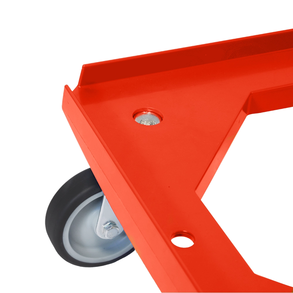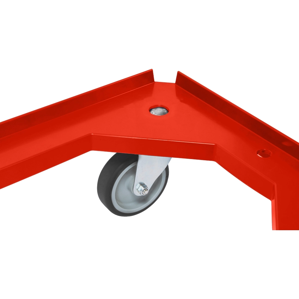 Chariot à roulettes rouge d'une capacité de charge de 250 kg, équipé de quatre roulettes pivotantes TPR.