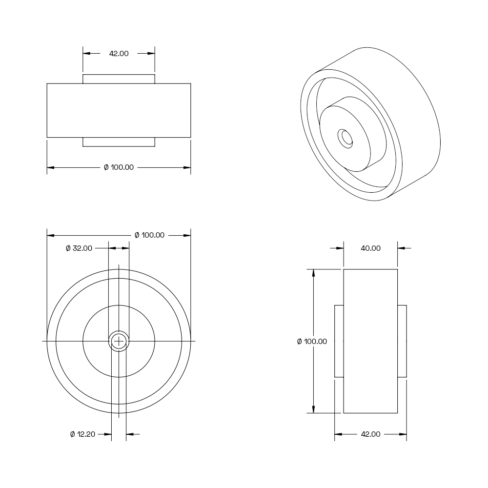 Roues en PU pour charges lourdes - 100 mm - 350 kg, il s'agit de roues en vrac pour charges lourdes d'un diamètre de 100 mm et d'une capacité de charge de 350 kg par roue. Le pneu est en PU (polyuréthane) et le corps de la roue est en aluminium.