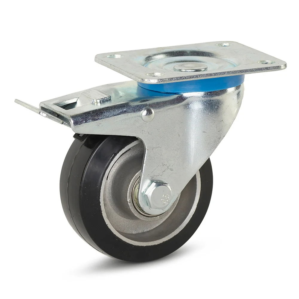 Roulette pivotante en caoutchouc élastique noir freinée avec plateau supérieur - 100mm - 220kg